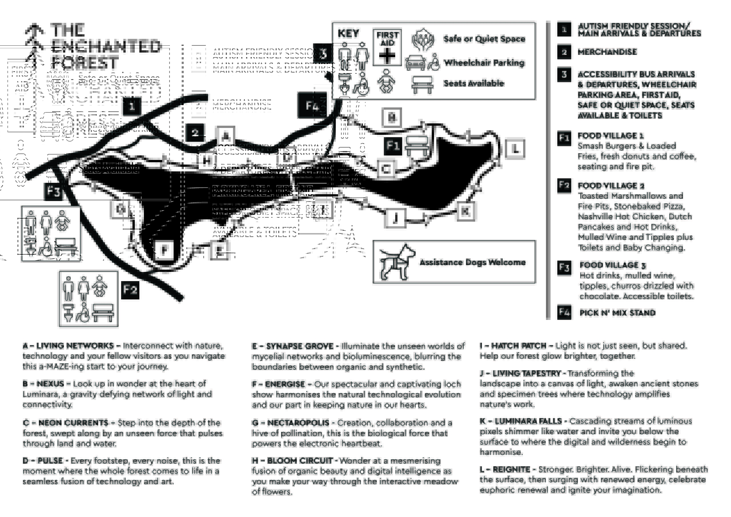 This is a black and white version of our show map for 2025, outlining the different installations with descriptions, areas for seating, arrival points for autism friendly sessions, the accessibility bus, and wheelchair parking. It also highlights the locations of our accessible toilets, safe and quiet spaces and catering areas. For a downloadable version in PDF format, click on the map.
